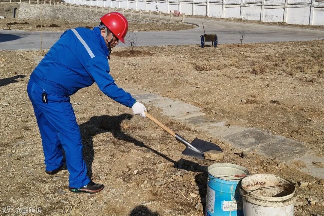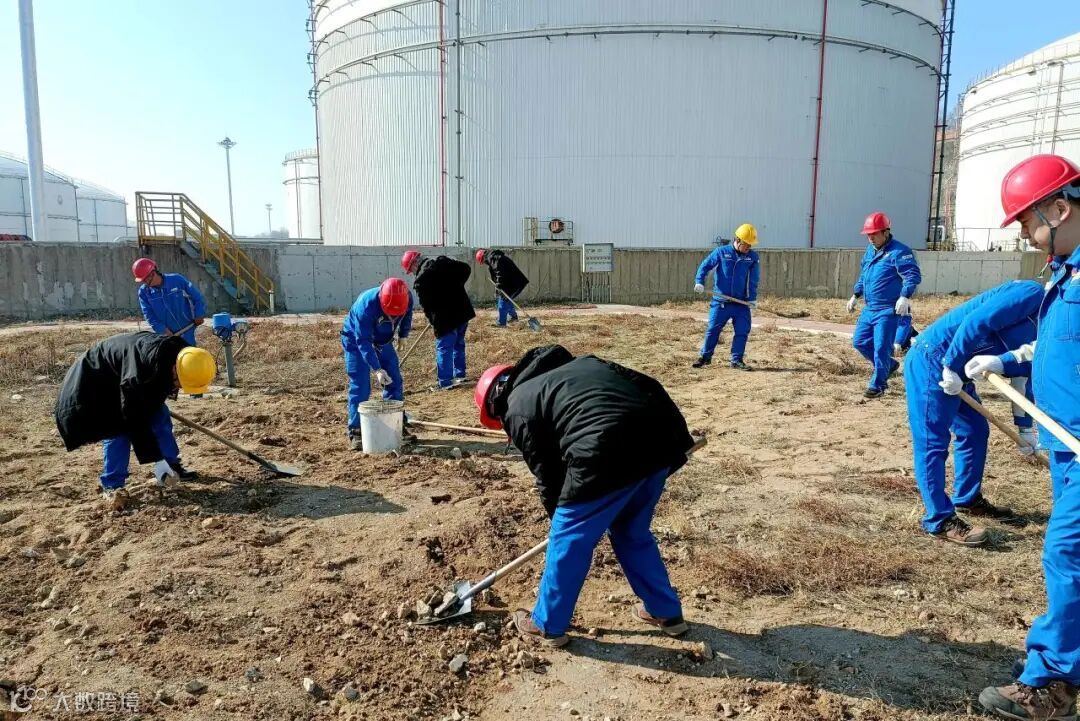 罐区内,碎石散落各处,大小不一,部分还夹杂在杂草中。大家弯腰用铁锹仔细铲起碎石,装入桶中;对于细小碎石,则徒手捡拾,不放过任何角落。