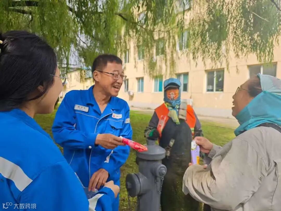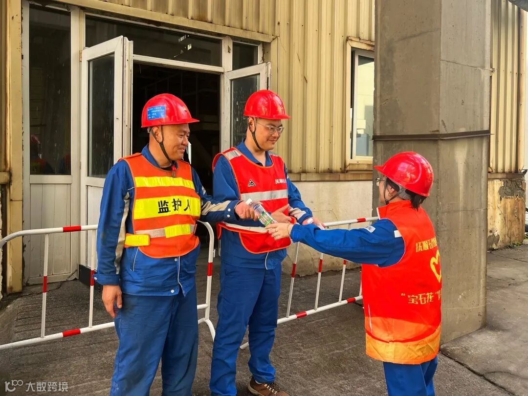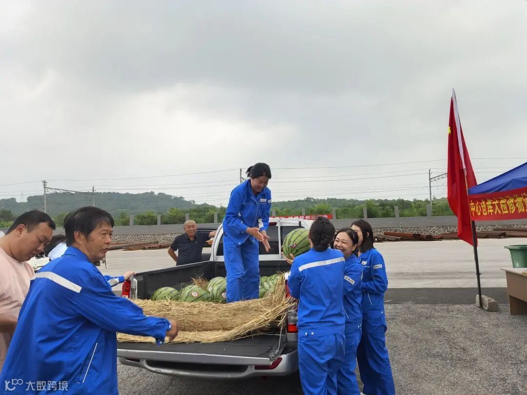 现场,工人师傅们刚从紧张忙碌的工作中暂时抽出身,看到志愿者们送来的西瓜,脸上都露出了欣喜的笑容。大家围在一起,接过西瓜,感受着这份来自后勤保障团队的温暖。志愿者们一边递西瓜,一边与工人师傅们交流,叮嘱他们注意防暑降温,话语间满是关切。