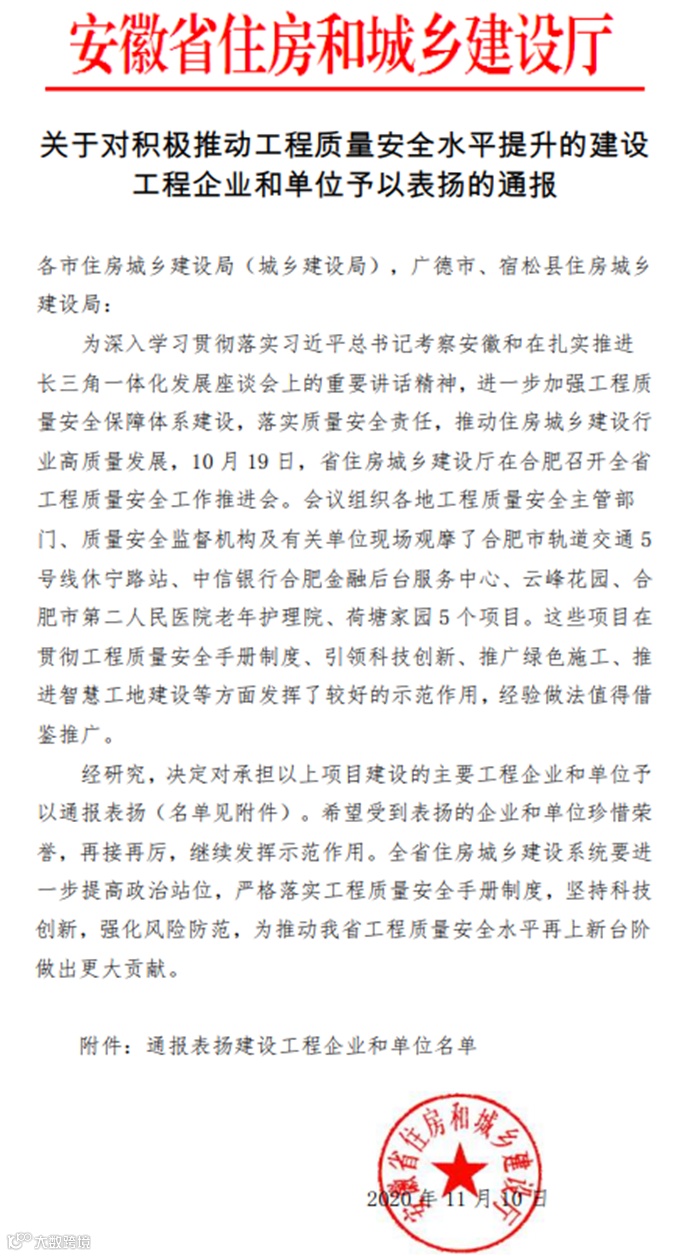 近日,由上海建科工程咨询有限公司提供监管一体化服务的荷塘家园二期项目积极参与了安徽省《工程质量安全工作推进会活动》,并成功举办现场观摩活动,荣获安徽省住房和城乡建设厅通报表扬。