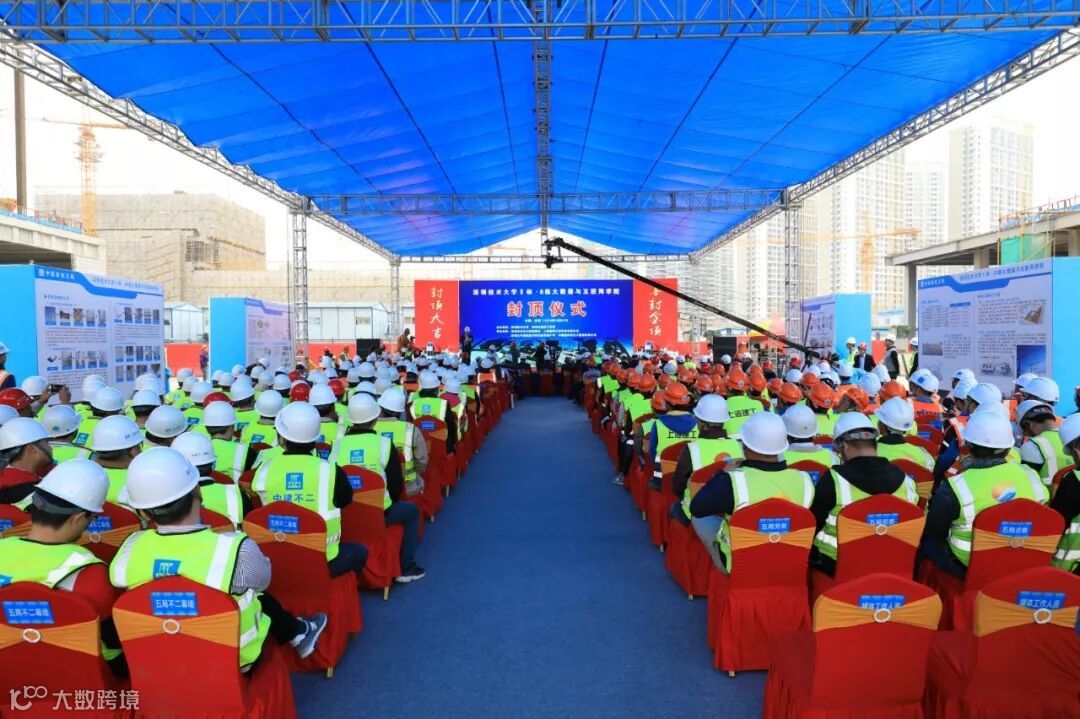 上午10时许,前来参加封顶仪式的有关领导和嘉宾在欢快的音乐声中步入会场,仪式由建设单位市工务署副署长胡汝林同志主持,胡署长表示,本项目工期紧、任务重和难度高,参建各方管理人员通力协作,创造出精品工程,意义十分重大。而后中国建筑第五工程局党委书记、董事长田卫国,深圳大学建筑设计研究院吴家骅老师,上海建科工程咨询有限公司党委书记、董事长张强,深圳市建筑工务署党组书记姚亮同志依次上台致辞,表达了对项目美好的祝愿,最后深圳技术大学校长阮双琛致辞并宣布“封顶”,现场采用无人机视频直播大数据与互联网学院楼屋面最后一斗混凝土浇筑,现场气氛十分热烈,掌声不断。