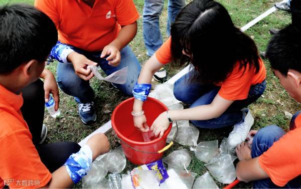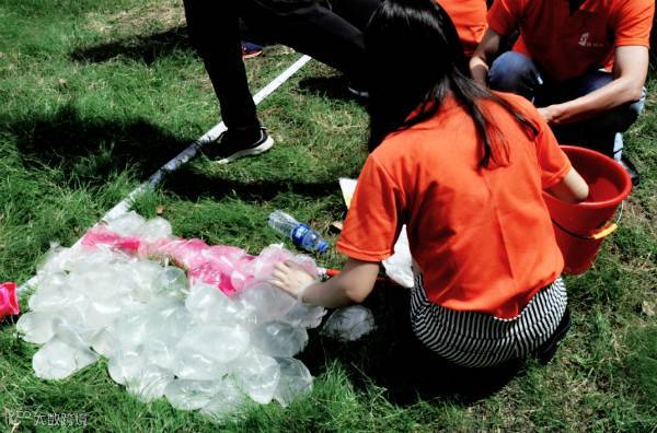 步调一致,齐心协力,你争我赶传送水袋,团队凝聚力在欢声笑语中提升……