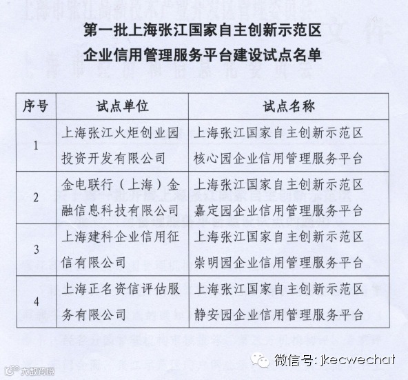 2014年11月,上海张江国家自主创新示范区企业信用管理服务平台建设试点单位名单公布,第一批4家单位中,上海建科企业信用征信有限公司榜上有名。