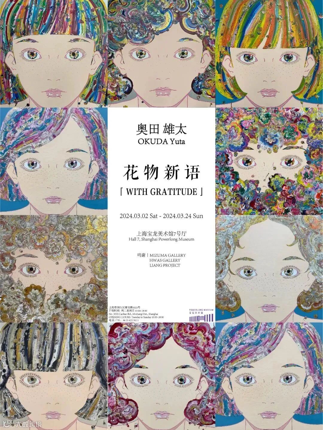 上海宝龙美术馆将于2024年3月2日至2024年3月24日举办奥田雄太个展“花物新语”(OKUDA YUTA:with Gratitude)。本次展览是奥田雄太在中国大陆的首次大型个展,将展出三个系列共63件作品。艺术家特意为此次中国展览创作了一组超过13米的巨型作品一朵花(一輪の花),以及12生肖和凝视(Watching you)系列,内容丰富,让观众能更好的理解和融入到奥田雄太所创作的花舞世界中。