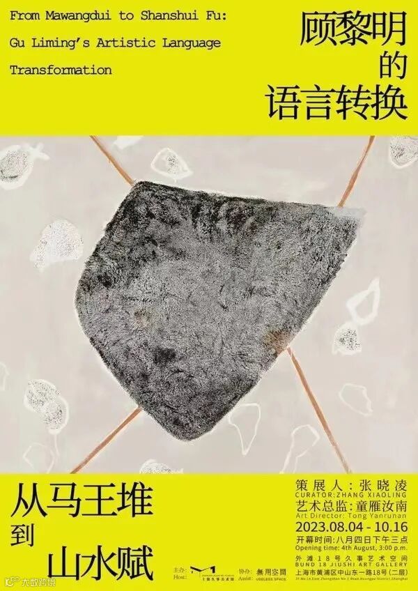2023年8月4日至10月16日,“顾黎明的语言转换——从马王堆到山水赋”将于外滩18号久事艺术空间展出。此次展览是近年来艺术家顾黎明的作品在上海较大规模的一次亮相。展览由上海久事美术馆主办,無用空间协办。张晓凌担任展览策展人,童雁汝南为展览艺术总监。