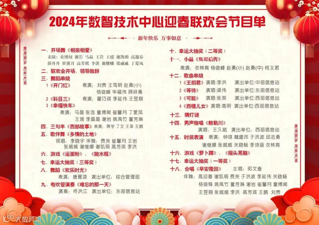 龙腾虎跃迎盛世,欢歌笑语迎新春。为进一步丰富员工文化生活,营造欢乐氛围,提升员工队伍的凝聚力和向心力。数智技术中心于2024年小年夜举办“金龙献祥瑞 数智向未来”新春联欢会。