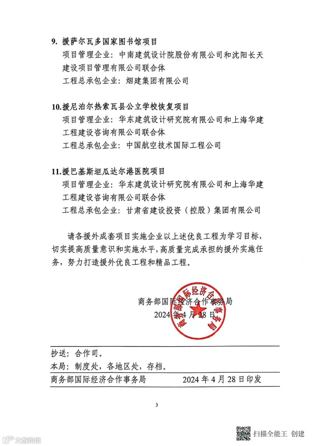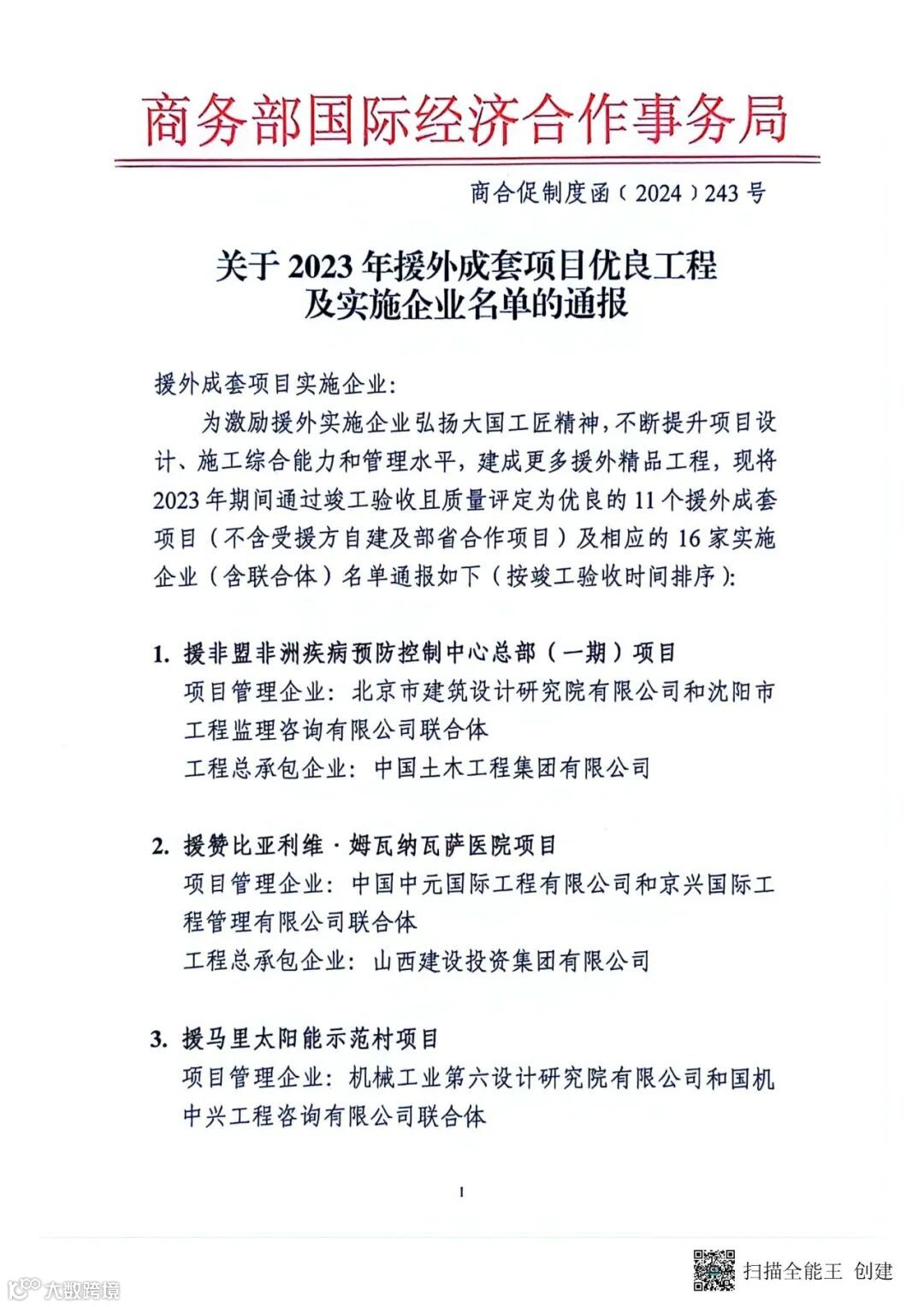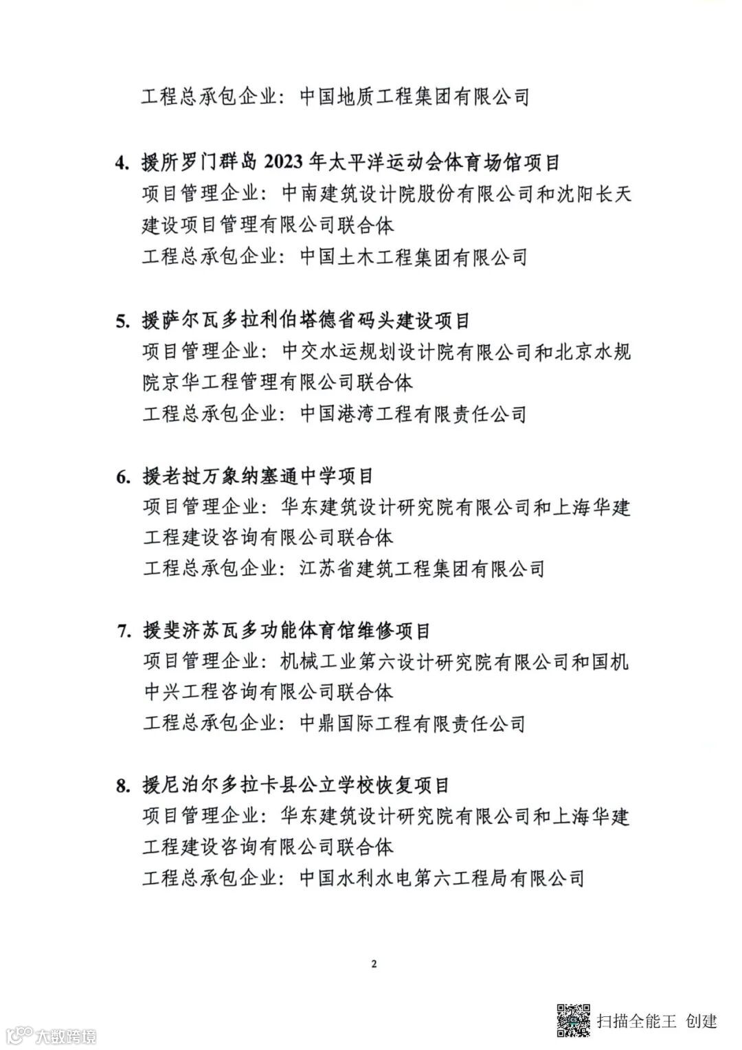 2024年五一劳动节前,在商务部国际经济合作事务局发布的《关于2023年外援成套项目优良工程及实施企业名单的通报》中,11个援外成套项目获得通报表彰,公司援老挝万象纳赛通中学项目、援尼泊尔多拉卡县公立学校恢复项目、援尼泊尔热索瓦县公立学校恢复项目及援巴基斯坦瓜达尔港医院项目等四个援外成套项目位列其中。