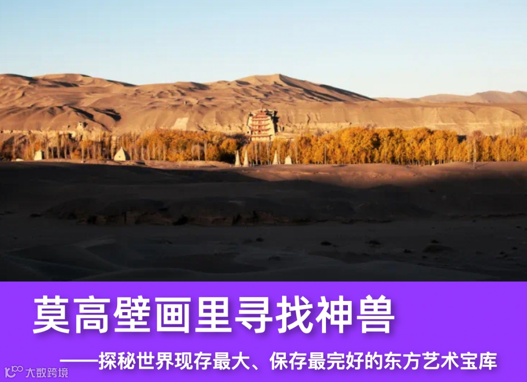 敦煌莫高窟,位于敦煌市东南25公里处,开凿在鸣沙山东麓断崖上,分布了三、四层不等,全长16公里。莫高窟现存石窟492个,壁画总面积约4500平方米,彩塑像2100多身。在这里时间仿佛凝固,跨一步似乎就穿越千年,目之所及全是传世珍宝。此行,我们将在特导的带领下,参观不同朝代的洞窟,从青少年的视角出发,找寻隐藏在壁画里的莫高神兽。