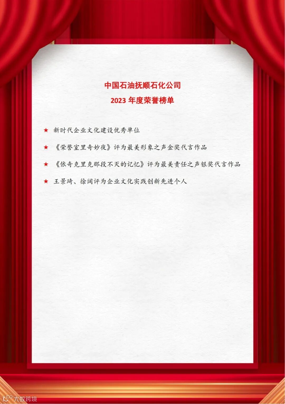 在中国企业文化管理协会2023年会上,抚顺石化公司被授予新时代企业文化建设优秀单位荣誉称号。公司党群工作部胡晶、石油二厂党群工作部岳鹏宇创作的反映中国石油精神教育基地、石油二厂中转站车间学大庆示范基地多年坚持学习践行石油精神大庆精神铁人精神的企业故事《荣誉室里奇妙夜》被评为最美形象之声金奖代言作品,后勤服务公司党群工作部姜伟、《抚顺石化报》编辑马潇楠创作的企业故事《依奇克里克那段不灭的记忆》被评为最美责任之声银奖代言作品。石油一厂加氢一车间党支部书记徐阔同志实施“六个标准化”为抓手建立车间文化建设理念实践体系、石油二厂重油催化车间党支部书记王景琦同志积极构建“情怀家国、方可行远”车间精神文化理念体系,两位同志被评为企业文化实践创新先进个人。