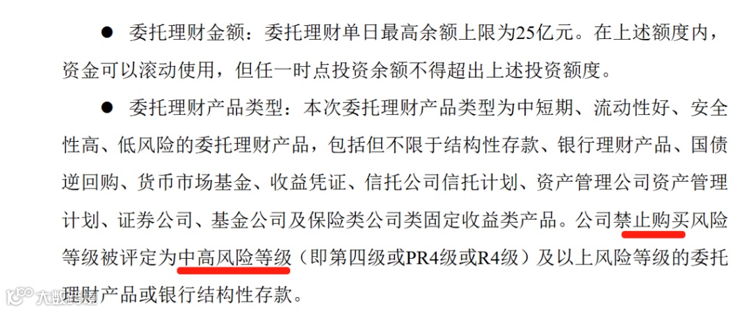 有的公司则在公告中明确写着“禁止购买风险等级被评定为中高风险等级(即第四级或PR4级或R4级)及以上风险等级的委托理财产品或银行结构性存款”,从而严格控制投资风险,保障公司资金安全。
