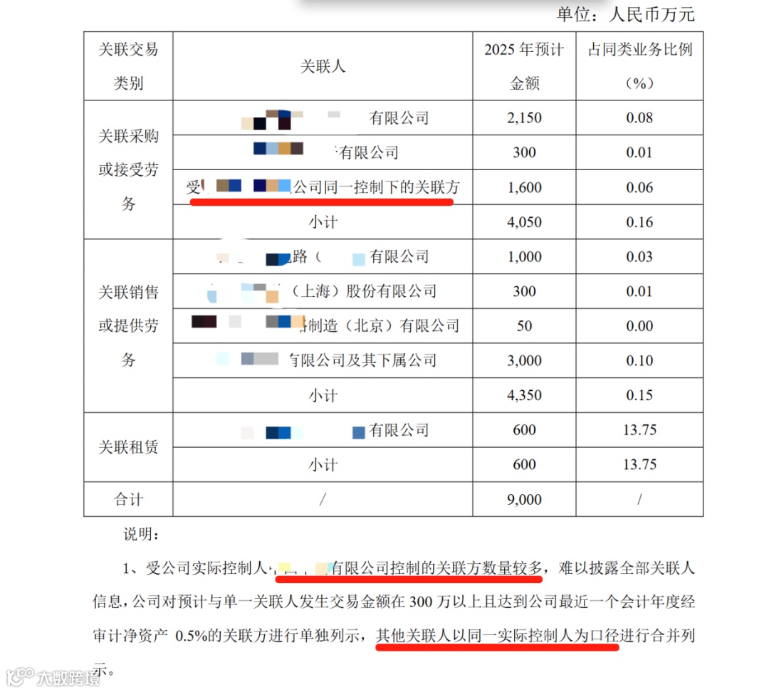 按照上述规则,预计与单一关联人发生交易金额在300万以上且达到上市公司上一年度经审计净资产0.5%的,应当单独列示。其他关联人可以同一实际控制人为口径进行合并列示。实践中,上市公司也有这么来操作的(如下图)~