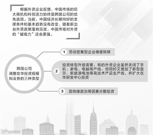 朱冰进一步分析表示,跨国公司调整在华投资规模和业务主要有几种类型:一是劳动密集型企业梯度转移;二是投资转型升级需要,有的外资企业虽然关闭了手机、家电、电脑等产线,但同时又增加了新型显示、新能源电池等高技术产品生产线,并扩大在华研发中心投资;三是因地缘政治等因素分散投资。