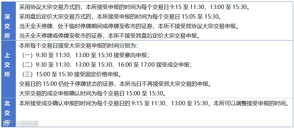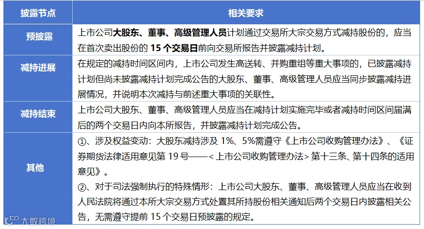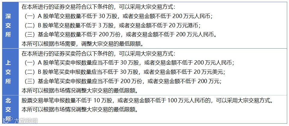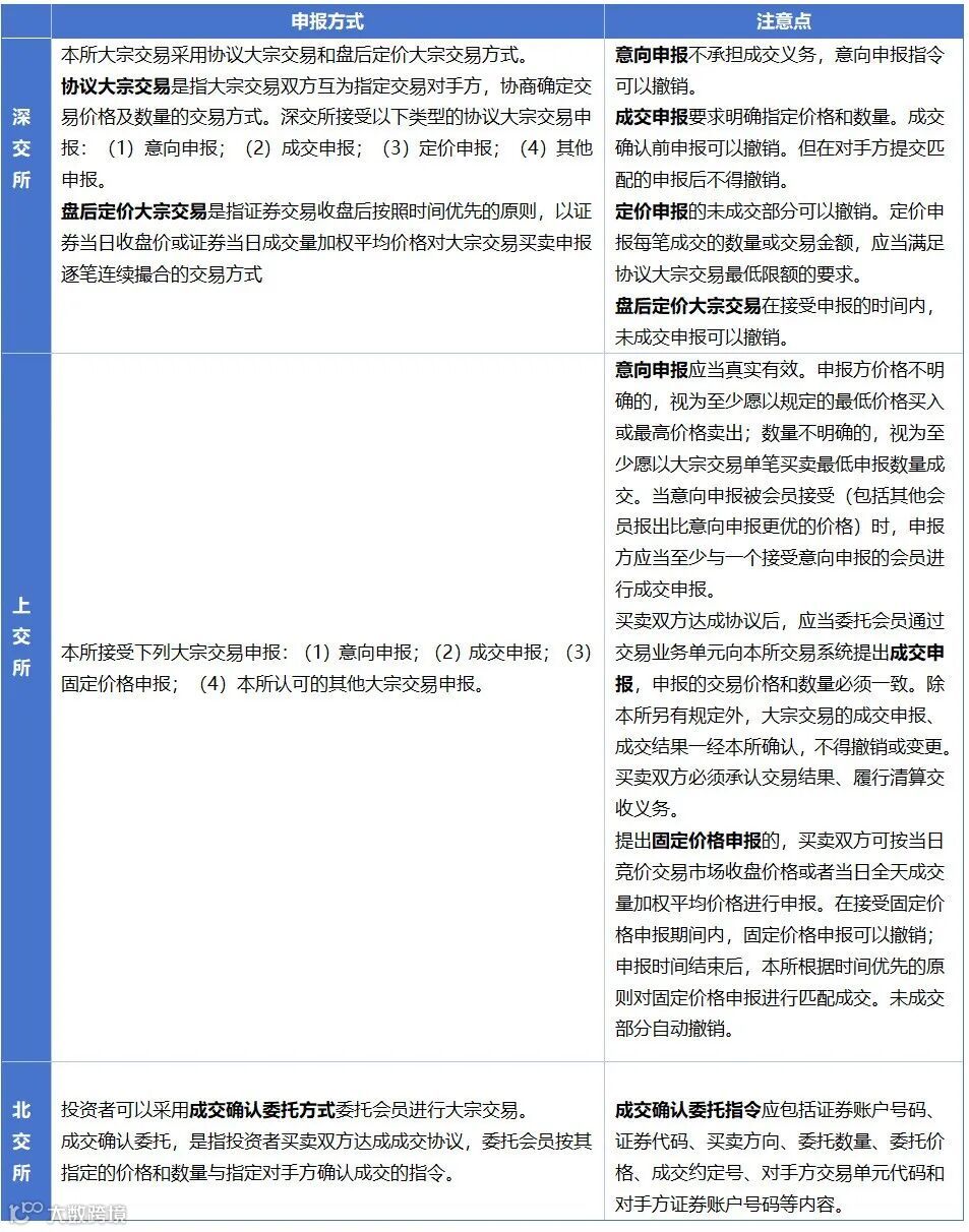 本文主要写了A股大宗交易的基本规则与减持监管要点,分别梳理了深交所、上交所和北交所在大宗交易的申报方式、时间、价格及数量门槛等方面的差异,并详细阐述了通过大宗交易进行股份减持的信息披露要求、比例限制、禁止情形及违规案例。