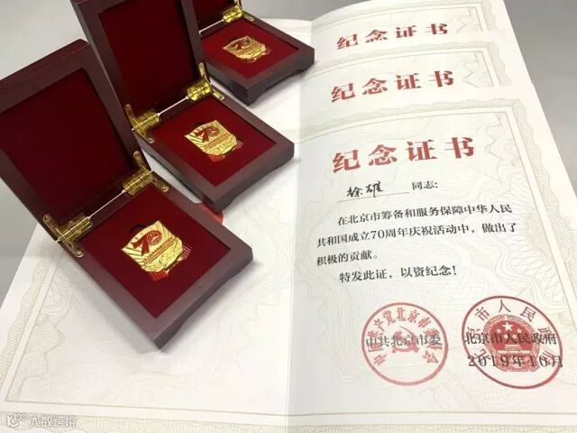 中共北京市委北京市人民政府授予东方时尚参与中华人民共和国成立70周年庆祝活动彩车保障任务的相关人员纪念证书及纪念章,以表彰其在庆祝活动中做出的贡献。