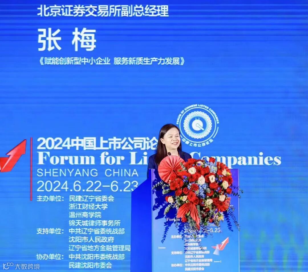 6月22日,2024中国上市公司论坛在辽宁省沈阳市举行。北京证券交易所副总经理张梅以《赋能创新型中小企业,服务新质生产力发展》为题发表演讲。