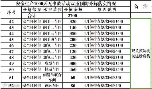 石油一厂落实《双重预防机制管理办法》,充分利用“大干1000天”奖励金建立班组员工识别风险和隐患的激励制度,按照员工发现和解决问题的等级分别给予20元至2000元不等奖励,激发了员工参与现场风险辨识和隐患排查的积极性和主动性。双重预防机制进班组,削减了生产现场安全风险,将HSE管理工作落到了实处。