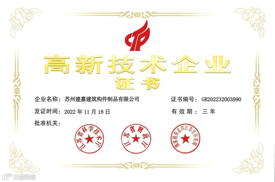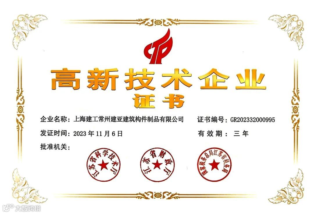 2023年11月,苏南构件公司下属的常州建亚建筑构件制品有限公司通过高新技术企业认定,成为继苏州建嘉后第二家获得高新技术企业认定的预制构件生产企业。