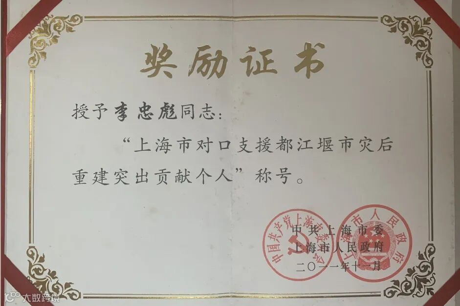 上海建工集团党委书记、董事长徐征(右一)为材三公司李忠彪(右四)颁发建工集团“十佳员工”证书