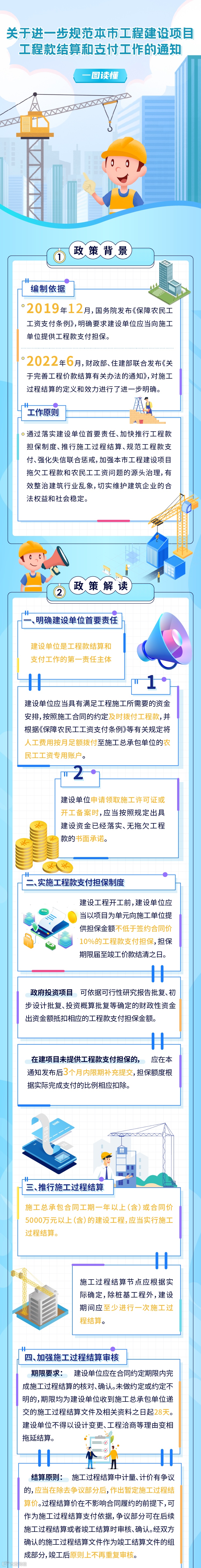 为有效整治建筑行业乱象,加强本市工程建设项目拖欠工程款和农民工工资问题的源头治理,切实维护建筑企业的合法权益和社会稳定,市住房城乡建设管理委会同人民银行上海分行、上海银保监局、市人社局、市交通委、市水务局、市绿化市容局等部门出台了《关于进一步规范本市工程建设项目工程款结算和支付工作的通知》,自2023年1月1日起在全市施行。具体内容,详见一图读懂。