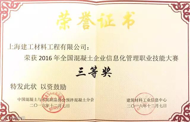 同时,在CCPA(中国混凝土与水泥制品协会)预拌混凝土分会2016会员代表大会暨预拌混凝土技术交流会上,公司获得2016年度全国预拌混凝土企业信息化管理职业技能大赛三等奖,公司总工程师吴德龙受聘为中国混凝土与水泥制品协会预拌混凝土分会副秘书长及“混凝土工程技术专家委员会”专家委员。