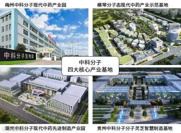 中科分子现拥有四大核心产业基地,分别为:潮州中科分子现代中药先进制造产业园、横琴分子态现代中药产业示范基地、梅州中科分子现代中药产业园、贵州中科分子分子灵芝智慧制造基地。基地具有智能化的生产设备、优良的生产环境和配套完善的软硬件设施。