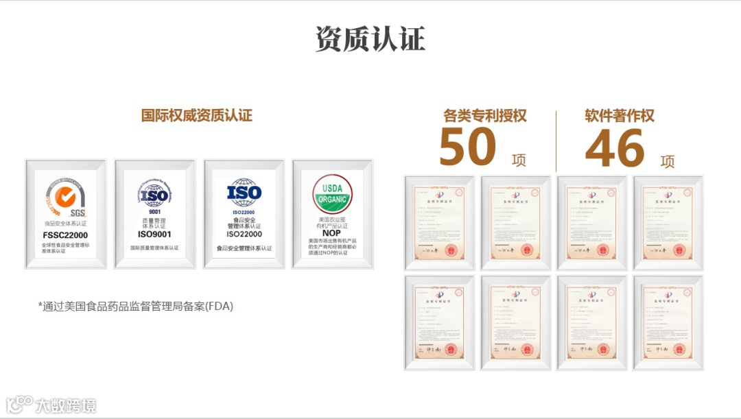 目前集团及下属企业已荣获50项国际、国家专利授权,46项软件制作权。公司已通过FSSC22000质量管理体系认证、ISO9001质量管理体系认证、ISO22000食品安全管理体系认证、NOP(美国农业部有机产品)认证等,并通过美国食品药品监督管理局备案(FDA)。