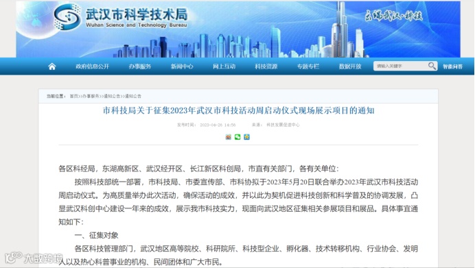 按照科技部统一部署,市科技局、市委宣传部、市科协拟于2023年5月20日联合举办2023年武汉市科技活动周启动仪式,目前正在面向武汉地区征集相关参展项目和展品,报名科技成果作品参展的企业或单位,可以免费在活动周上获得由市科技局主办方提供的易拉宝展位。关于本次活动周武汉市科学技术局具体通知如下: