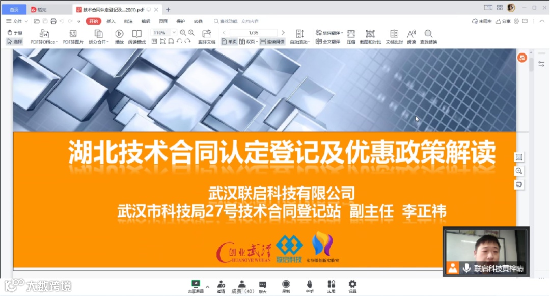 2022年11月15日下午,由武汉市中小企业发展促进中心指导,武汉市“创业之家”光谷微创新实验室、武汉联启科技有限公司联合举办的“技术合同登记优惠政策”线上培训会圆满举行,四十余人线上参与了此次活动。
