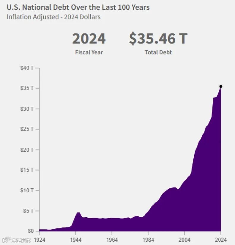 图三、在过去的100年,美国联邦债务已从1924年的3,950亿美元增加至2024年的35.46万亿美元。