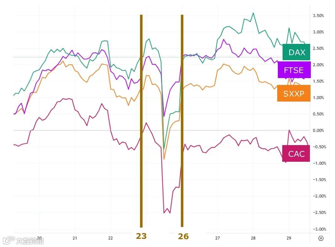 图一、5月23日至26日期间,欧洲主要股市指数随着特朗普的贴文波动起伏。欧洲Stoxx 600指数、德国DAX指数、英国FTSE 100指数与法国CAC 40指数皆出现连动反应。
