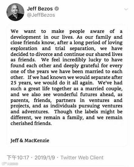 这句话来自于世界首富亚马逊CEO贝索斯在Twitter上宣布的一则,声明中还有两人的签名。