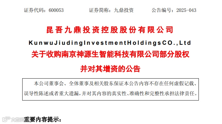 昆吾九鼎投资控股股份有限公司(以下简称“公司”或“九鼎投资”)拟通过收购股权及增资方式,以人民币21,315.88 万元获得南京神源生智能科技有限公司(以下简称“南京神源生”)53.2897%股权。本次收购股权交易,公司拟以现金方式合计受让南京神源生 37.7196%的股权(后续增资完成后将稀释为 28.2897%),交易对价合计为 11,315.88 万元。本次收购股权完成后,公司拟以人民币 10,000.00 万元对南京神源生进行增资并获得增资后25%的股权。本次交易完成后,公司最终将以人民币 21,315.88 万元获得南京神源生 53.2897%的股权,南京神源生将成为公司控股子公司,纳入公司合并报表范围。