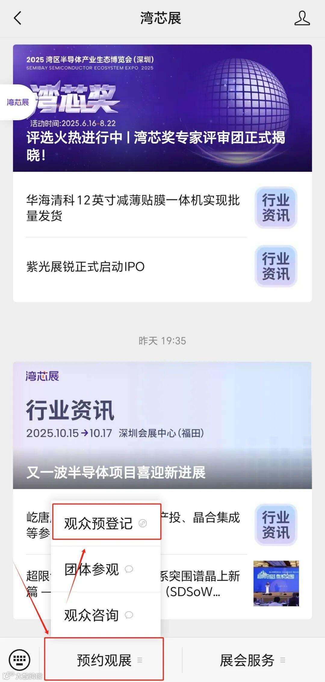 · 微信公众号:打开“湾芯展”微信公众号,首页菜单栏点击“预约观展”——“观众预登记”;