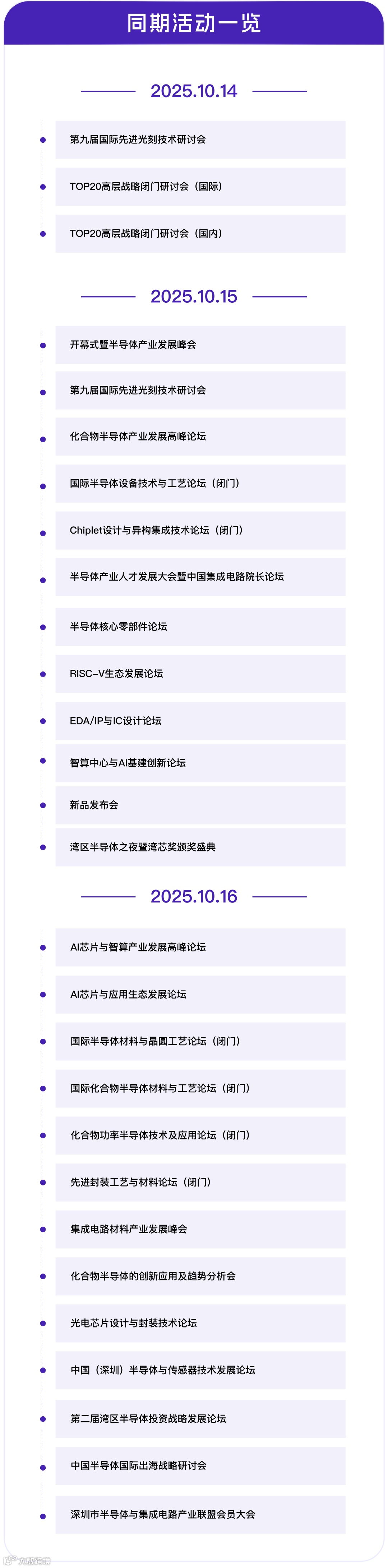 2025 湾区半导体大会由 两大高端研讨会、一场开幕式暨半导体产业发展峰会及 20 + 技术论坛组成,聚焦光刻、设备、零部件、材料、先进封装、IC设计、人工智能(AI)、出海、投融资、人才等行业热门与重要议题,邀数百位行业大咖分享前沿与趋势,打造年度思想盛宴。