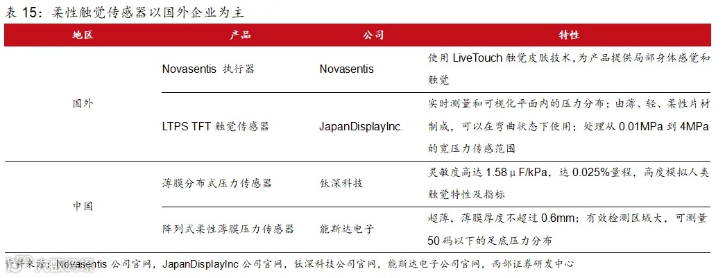 目前柔性触觉传感器技术由国外企业领先,全球范围内生产商主要包括Novasentis、Tekscan, Inc.、JapanDisplayInc.、Baumer Group、Fraba Group、Syntouch、Canatu、Sensel、FORCIOT、钛深科技等。根据研精毕智市场调研网,2022年全球CR5约为57.1%。