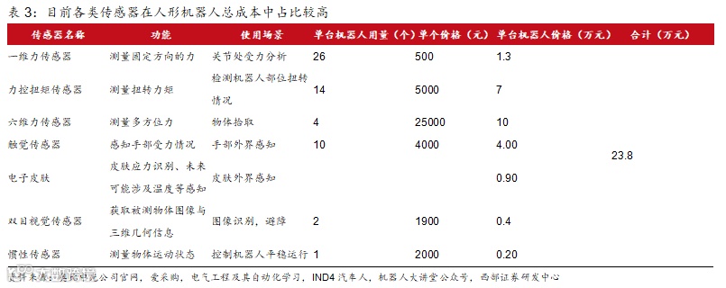 根据下表中我们对人形机器人各类传感器的价值量以及用量进行的测算,预计一整台人形机器人的传感器成本约为23.8万元,如以目前样机阶段一台人形机器人价值量55万元进行测算,则各类传感器合计在人形机器人中成本占比在43%左右。