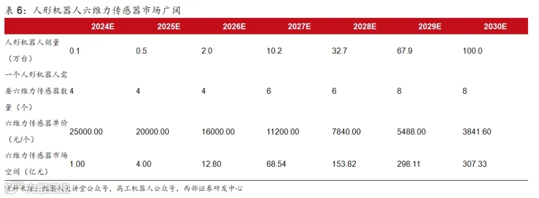 根据以下假设,对六维力传感器在人形机器人不同销量下市场空间进行预测: