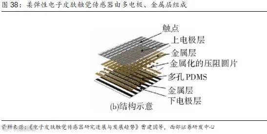 目前人形机器人电子皮肤暂未形成批量出货,根据此前电子皮肤价格作为参照,我们假设一台人形机器人目前需要使用的电子皮肤价值量为0.9万元。考虑电子皮肤降本因素,假设2030年人形机器人销量达到100万台,则对应市场空间约为36亿元。从实际角度出发,考虑到对于人形机器人性能要求的提升,电子皮肤覆盖面积有望同步提升,市场空间有望超过我们的测算。