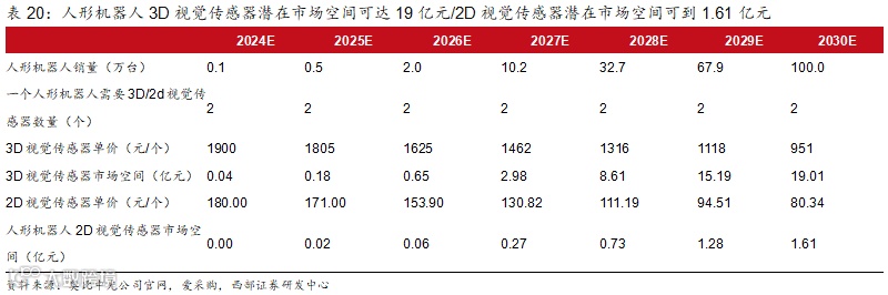 假设人形机器人使用2D视觉传感器产品,以目前180元/台的市场价格进行预测,同样考虑到降价等因素,预计100万台人形机器人对应的视觉传感器市场空间约1.61亿元。