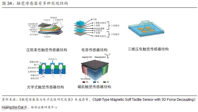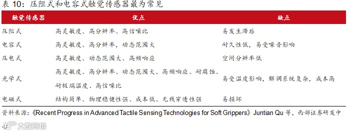 机器人触觉传感器有基于电阻式、电容式、压电式、热释电式、电磁式、磁电式、力敏式、光电式、超声波、光纤等的触觉测量方法。
