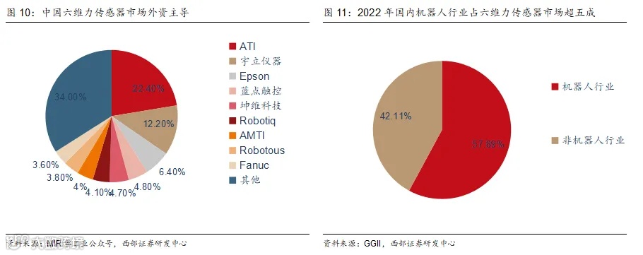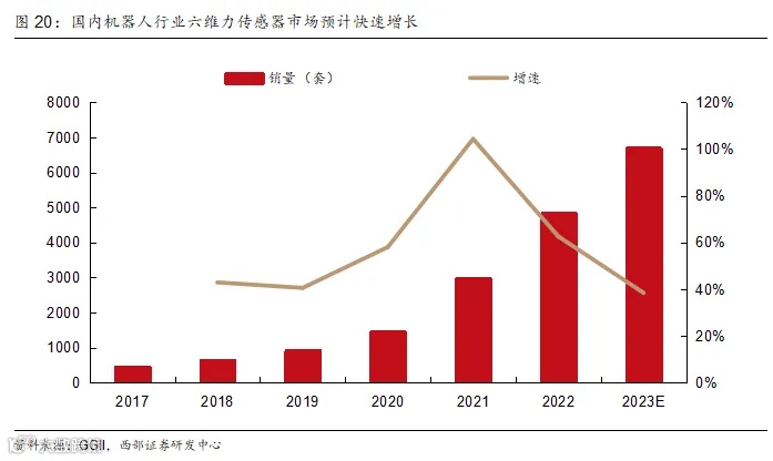 除人形机器人行业外,工业机器人行业六维力传感器需求增速同样较快。据高工机器人产业研究所(GGII)数据,2022年中国机器人行业六维力传感器销量为4840套,同比增长62.58%,预计2023年销量突破6700套,增速约40%。