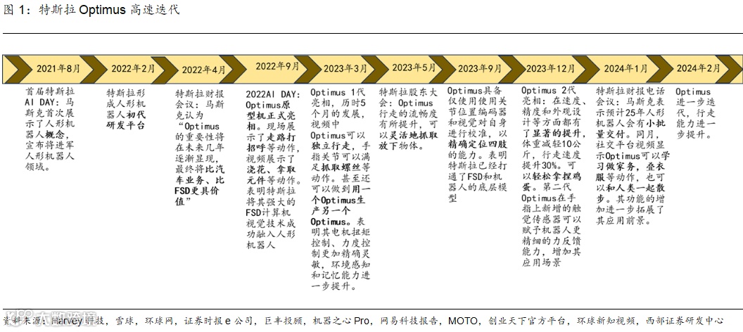 人形机器人技术高速迭代,产业落地指日可待。近年来人形机器人行业发展迅速,以特斯拉人形机器人为例,自特斯拉于2021年宣布进入人形机器人领域以来,特斯拉机器人Optimus已经具备独立行走、视觉定位、精准施力等能力,目前已经在工厂进行工作测试,进化速度快,并有望快速实现量产。除此之外,国外Figure机器人、波士顿动力机器人,国内优必选机器人、宇树机器人等也在持续提升性能中。随着各类人形机器人性能的不断精进,人形机器人商业化速度正在加快。