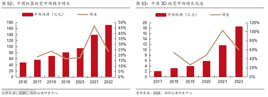 GGII数据显示,2022年中国机器视觉市场规模170.65亿元,同比增长23.51%。其中,2D视觉市场规模约为152.24亿元,同比增长20.21%,3D视觉市场约为18.40亿元,同比增长59.90%。