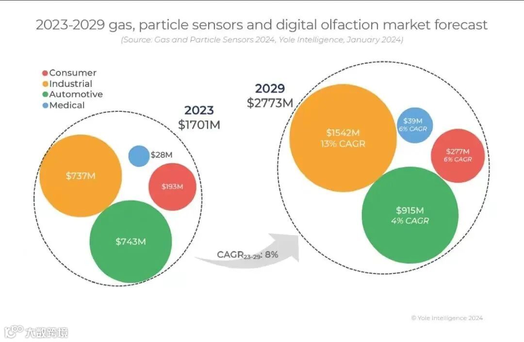 近年来,人们对健康和环境的认识不断提高。多款空气质量监测仪已经开发出来,帮助气体和颗粒传感器市场在 2023 年至 2029 年间分别增长 8% 和 11%,到 2029 年市场总规模将达到 28 亿美元。对于数字嗅觉,该领域仍然由用于研发项目和服务的销售产品;我们预计 2029 年将达到 5200 万美元。
