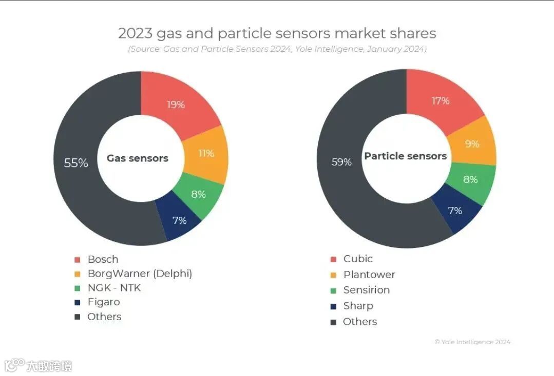 气体传感行业的主要份额由汽车厂商(博世、博格华纳和 NGK-NTK)占据。如果我们不考虑汽车O2 和 NOX 气体传感器,Figaro 是领先者。对小型化和低功耗的需求仍然存在,因此涉及NDIR和MOX技术的厂商正在占据更多的市场份额。自 COVID-19 以来,气体传感厂商开始涉足气体监测业务。由于缺乏有关这些探测器、其性能以及数据表示方法的立法,此类设备的客户感到困惑。这是疫情以来消费市场保持相对稳定的原因之一。在气体传感领域,最近发布的产品数量表明这个生态系统仍然充满活力:采用PAS或NDIR技术的传感器,或基于MOX技术的多气体传感器。在粒子传感方面,市场领导者是 Cubic Sensor。业界见证了越来越多的中国公司为消费应用提供低成本解决方案。数字嗅觉生态系统仍在新兴,我们注意到过去几年进行了一些融资(6400 万美元)。