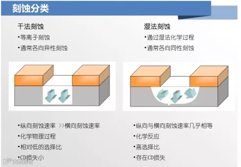 硅的湿法各向异性刻蚀是最早开发的微加工技术,湿法刻蚀是利用被刻蚀材料与刻蚀溶液发生化学反应进行刻蚀,而干法深刻蚀是利用深反应离子刻蚀(DRIE)进行硅的各向异性刻蚀,是20世纪70年代以来新发展的深刻蚀技术。