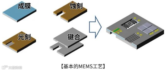MEMS工艺以成膜工序、光刻工序、蚀刻工序、键合工序等常规半导体工艺流程为基础。除通用工艺外,由于MEMS器件结构的特殊性,也衍生出许多特殊制造工艺。