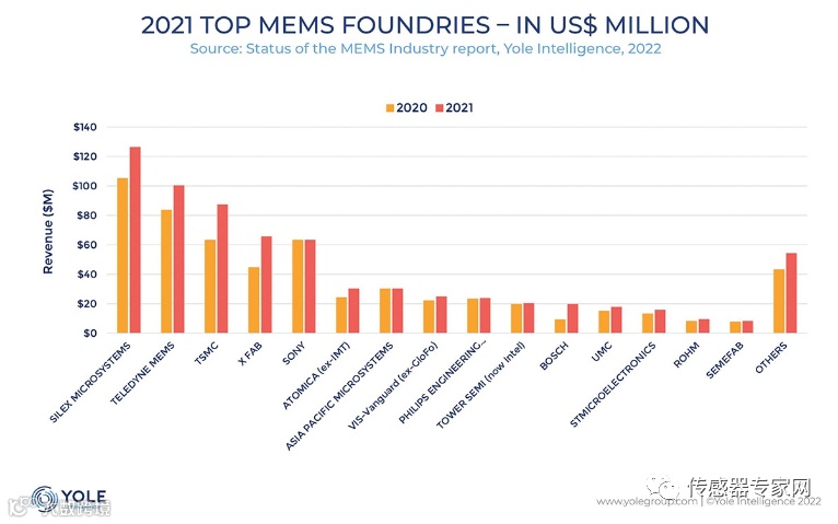 据Yole公司2022年MEMS产业报告显示,Silex Microsystems AB位于瑞典Jarfalla,是一家纯MEMS代工厂,在赛微电子的经营下,Silex于2019、2020、2021连续三年市场份额排名全球MEMS代工第一。