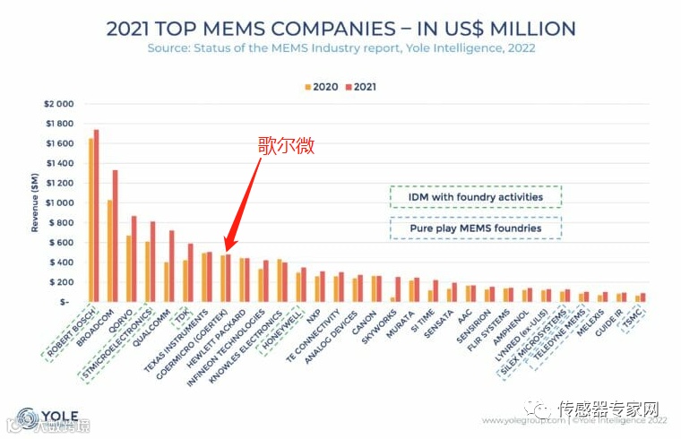 歌尔微电子是中国最大的MEMS传感器企业。据Yole发布的2022年MEMS产业报告显示,歌尔微电子的MEMS传感器销售额位居全球第8,连续3年进入全球MEMS厂商10强之列,是中国MEMS领域唯一进入全球10强的企业。