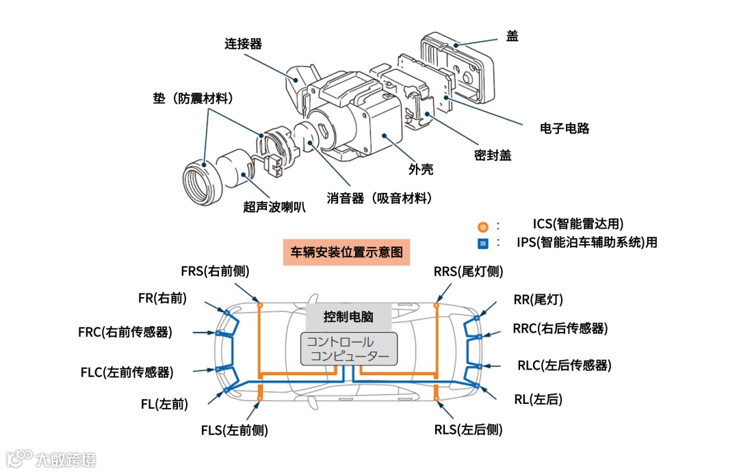 超声波传感器,由超声波喇叭、用于处理影像和计时的芯片等零部件组成。
