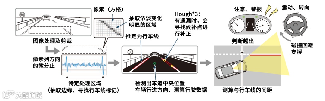 从经过处理的图像上抽取边缘画面(亮度变化大的区域),从边缘画面中找出行车线标记(车道两侧的实线及虚线,直道显示为直线),通过行车线标记测定车道。